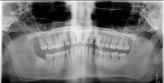 While there are many issues with this image, you can see that one side the mandible is distorted and larger. The corrective action here is to make sure the patient is facing directly forward in the chinrest.