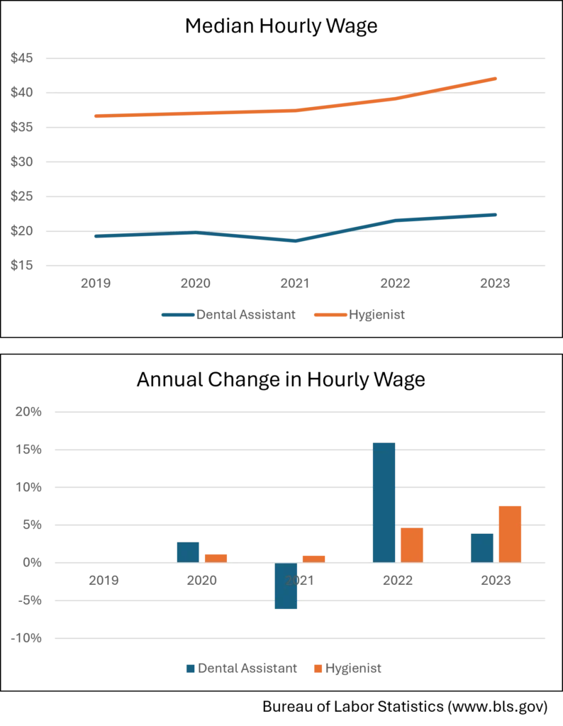 Based on BLS data, you can see how he rate of inflation affected the national median wage for dental assistants and hygienists. While assistants saw a more dramatic change year over year, it is starting to normalize. However, hygienists have seen steadier growth that has persisted into the most recent year recorded.