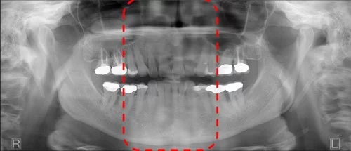 If a panoramic image shows any solid white triangular shapes along the very bottom, this typically points to a lead apron that was captured in the scan.