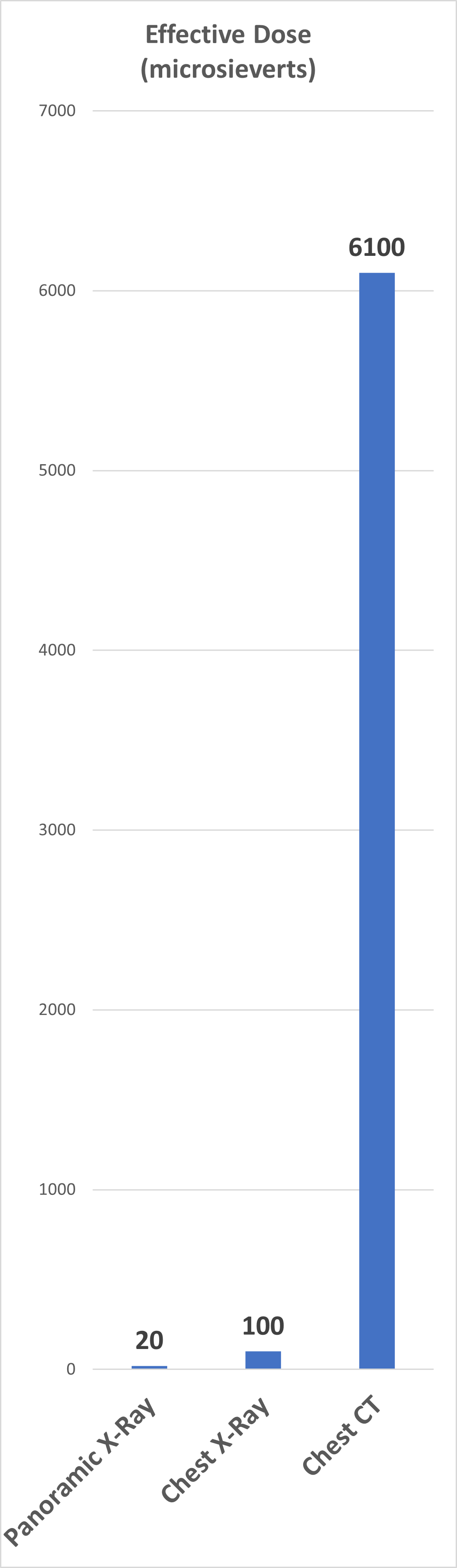 As a point of reference, the effective radiation dose of a typical panoramic x-ray is about 10 microsieverts, while a traditional medical CT may be in the range of 1000 – 10,000 microsieverts (100 to 1000 times). It’s also worth noting that the panoramic scan takes roughly 10 seconds.